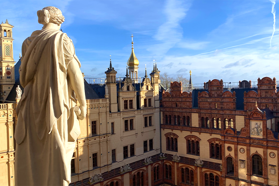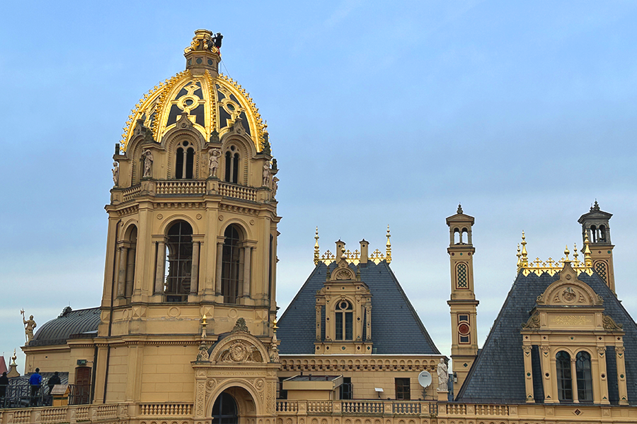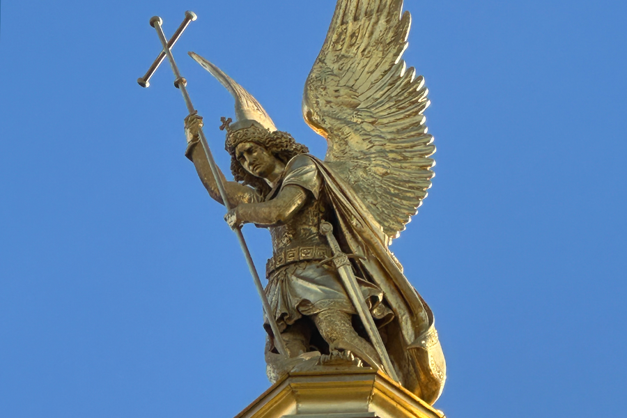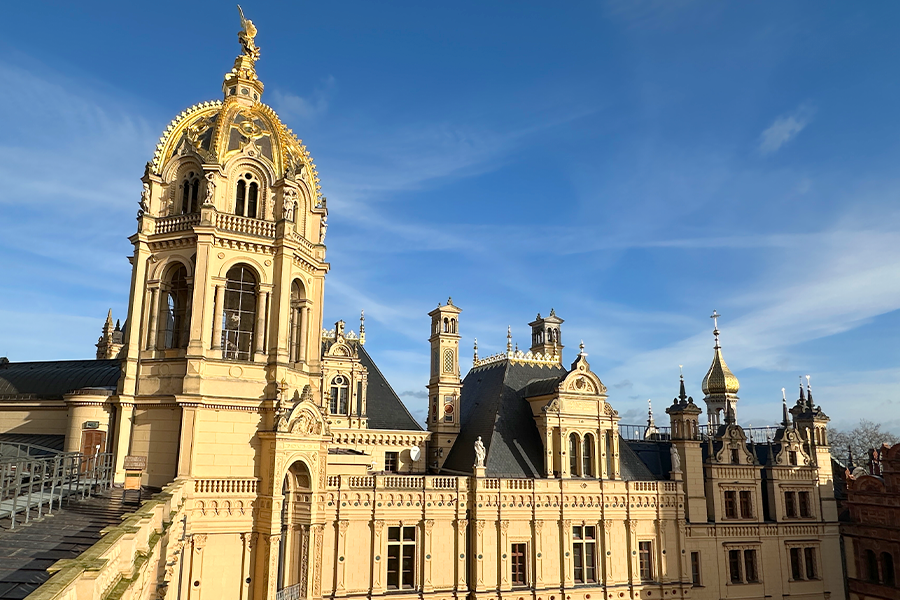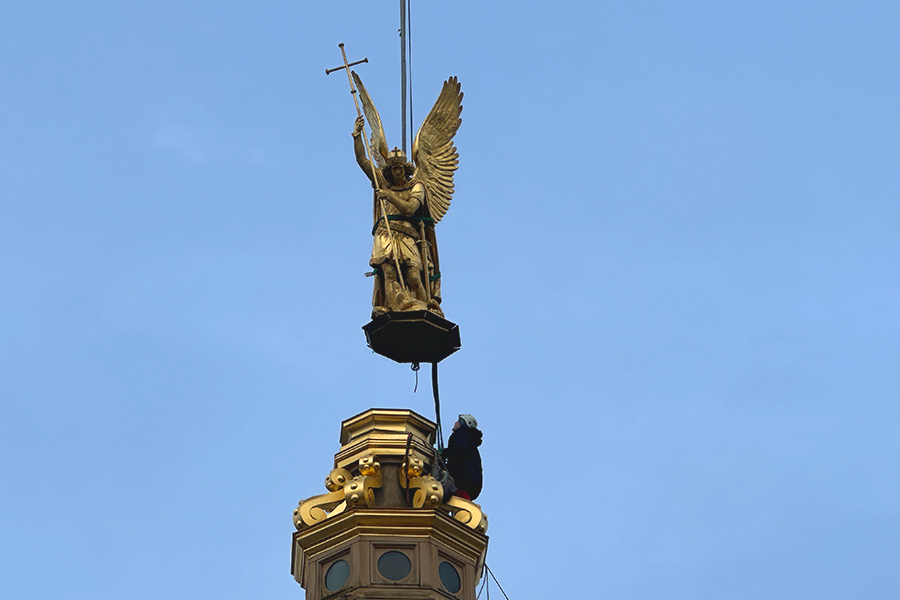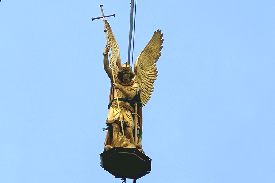 Der goldene Erzengel, der auf der Prunkkuppel des Schlosses Schwerin thront, wurde am achten Februar 2024 mittels Krans von der Kuppel gehoben, um anschließend in einer Berliner Werkstatt restauriert zu werden. Zeitgleich wird die goldene Prunkkuppel eingerüstet und ebenfalls einer Sanierung unterzogen.