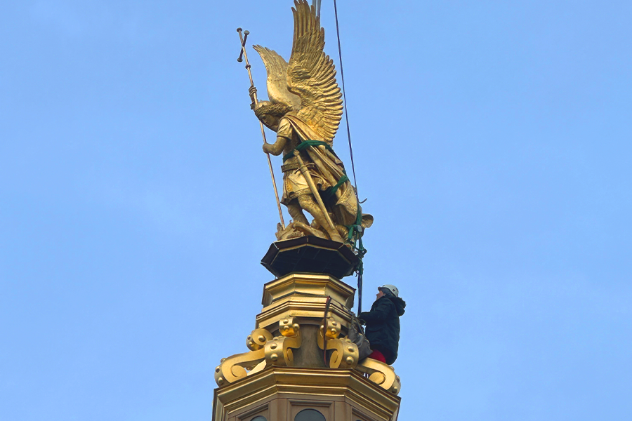 Die Zinkgussfigur des Hlg. Michael oder „Erzengel Michael, den Drachen tötend“ auf dem Prunkturm des Schlosses Schwerin stammt aus dem Jahr 1857. Sie ist vergoldet. Die Restaurierungsarbeiten umfassen neben der Laserreinigung, die Risssanierung und Überprüfung von Lötnähten sowie den Korrosionsschutz und die Vergoldung.