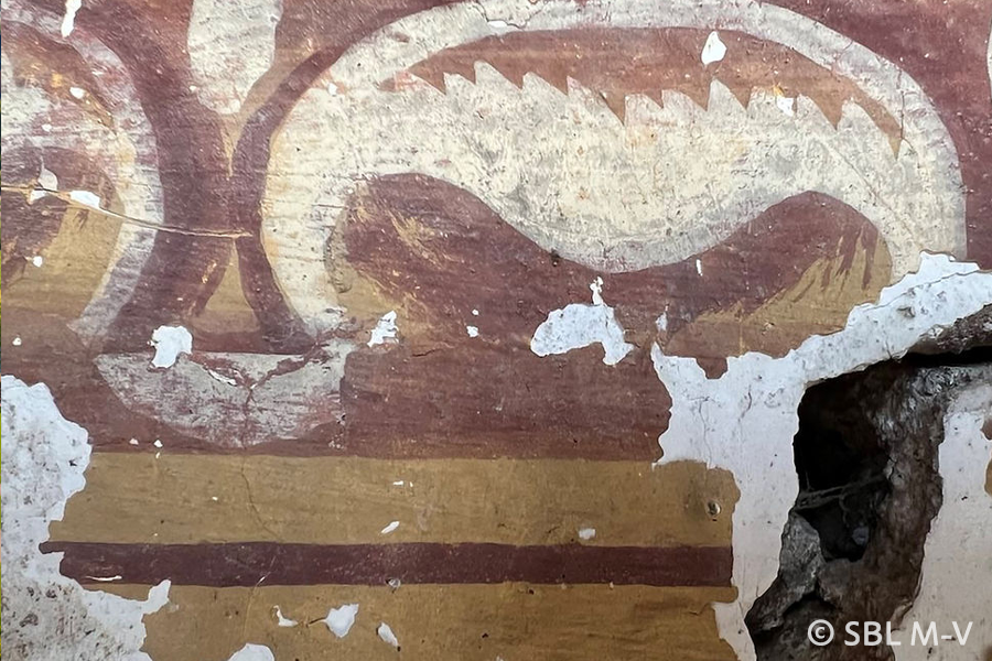 Die illusionistische Ausmalung der Nische stellt u. a. sogenannte Triglyphen dar, also senkrechte Rillendarstellung in Anlehnung an den Fries eines griechischen Tempels. Die Farbfassungen gehen von beige-sandfarbenem Untergrund über braunrote Schatten der Rillen hin zu weißen Zierelementen.